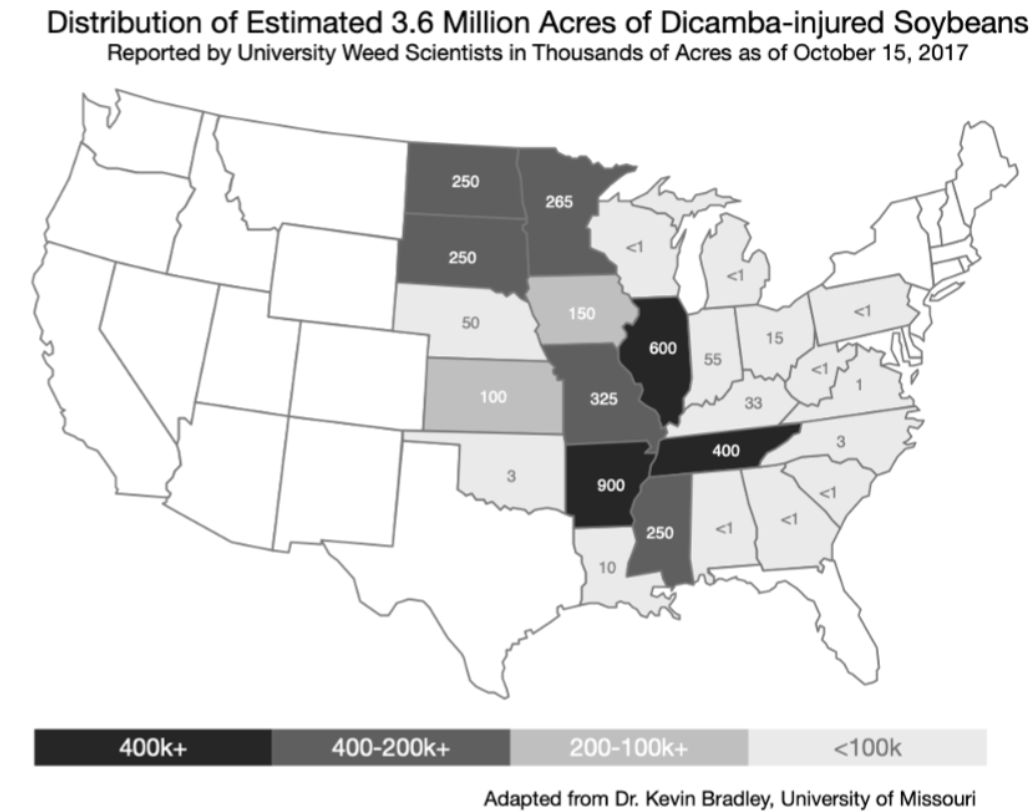 Distribution of dicamba-related soybean injuries known in 2017.