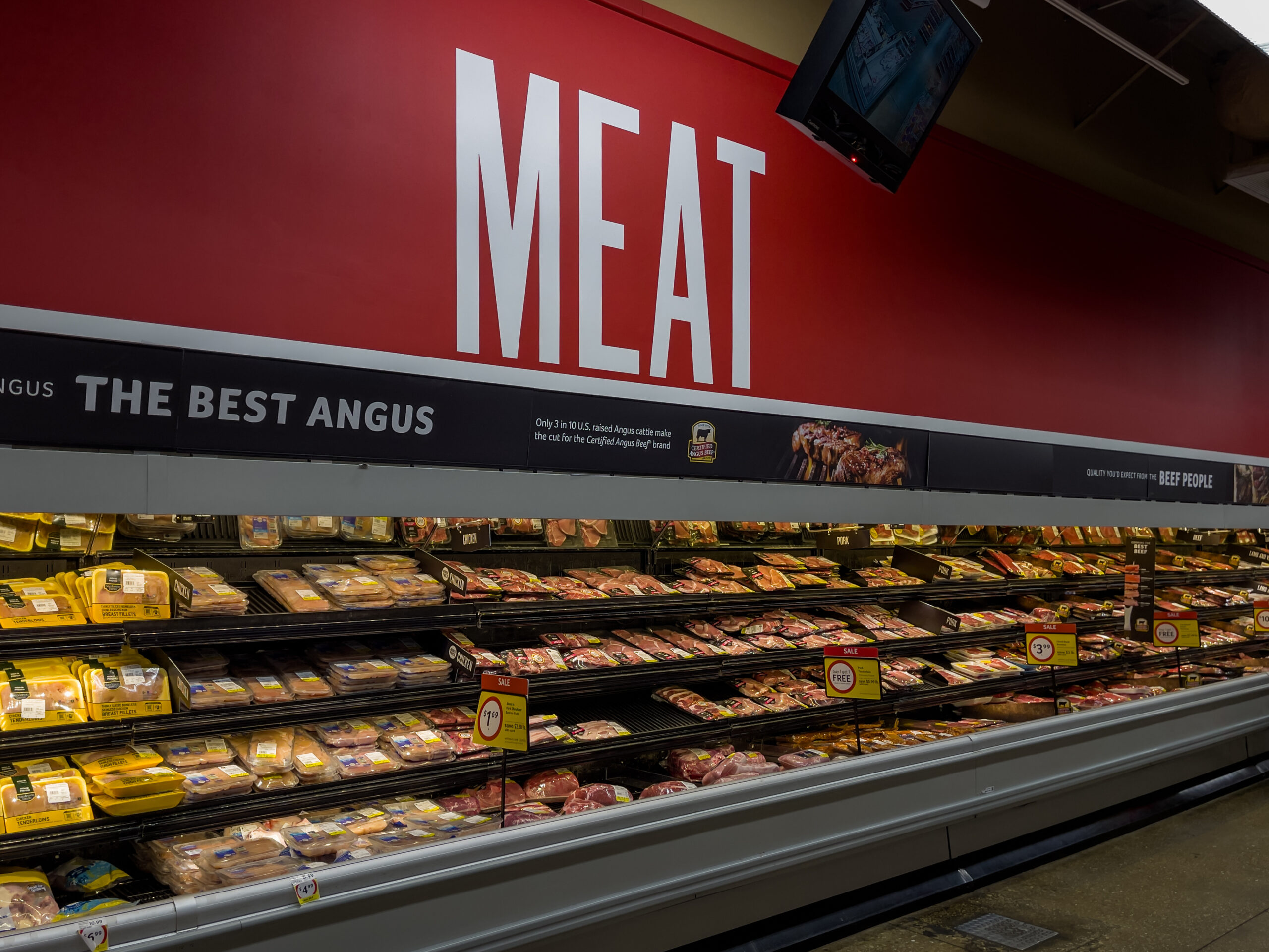 PORT CHARLOTTE, FLORIDA – JANUARY 22, 2021 : Fresh meat sign and meat product display in an American grocery store.