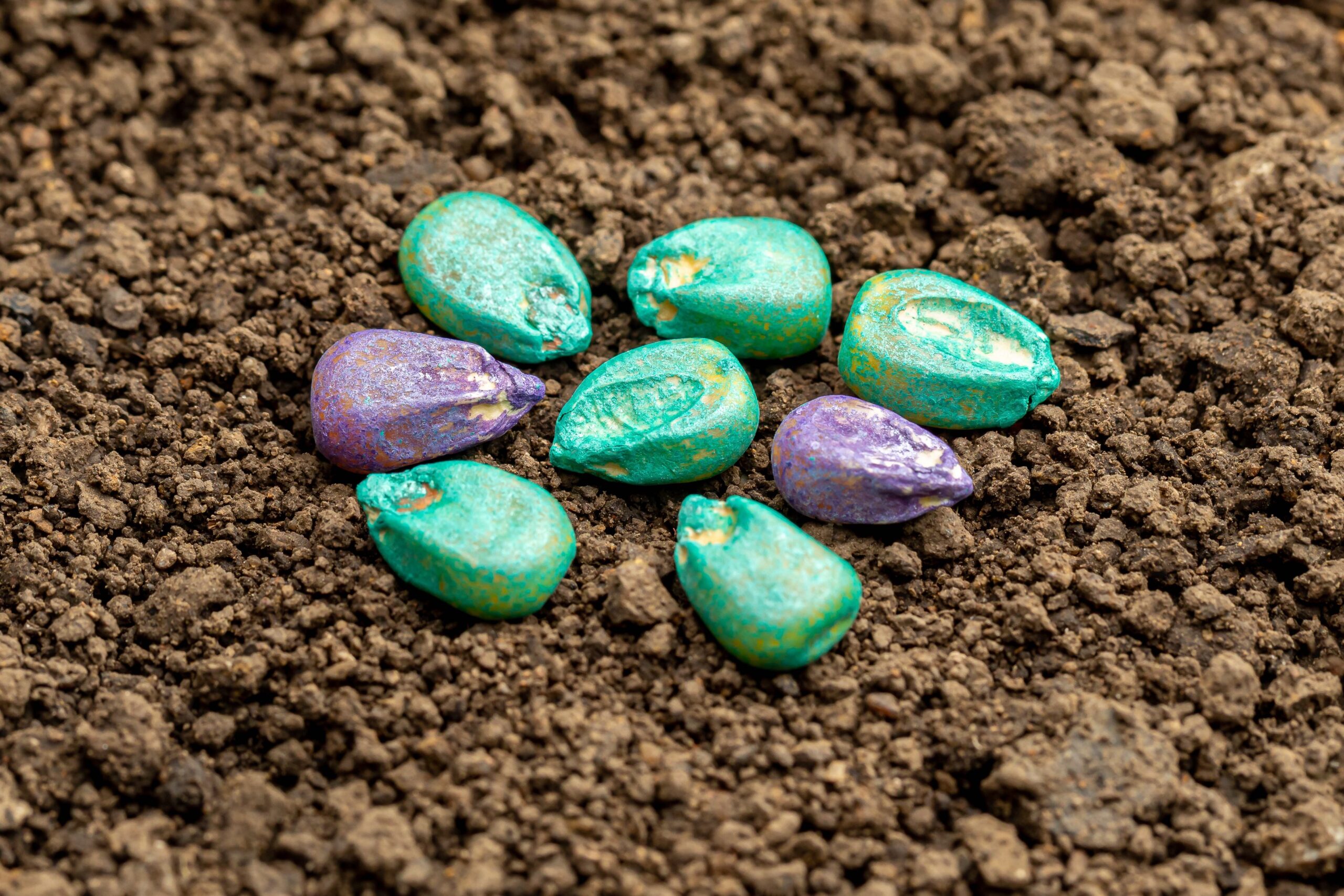 Closeup of treated corn seed. Corn seed treatment for insect, pest control and disease management concept