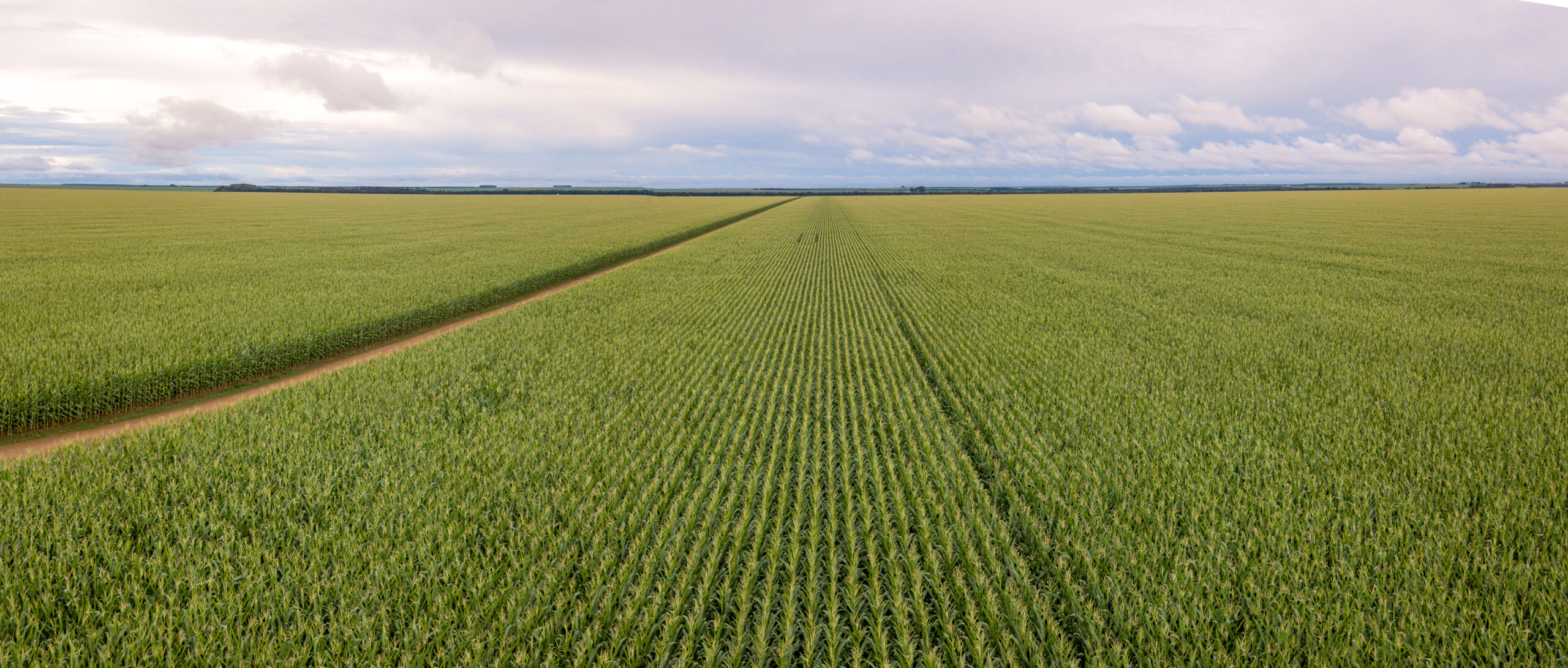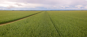 Aerial view of Cornfield and dirt road in clear summer day. Agriculture, harvest and farm concept. Genetically modified and transgenic corn for export, produced in Mato Grosso, Brazil.